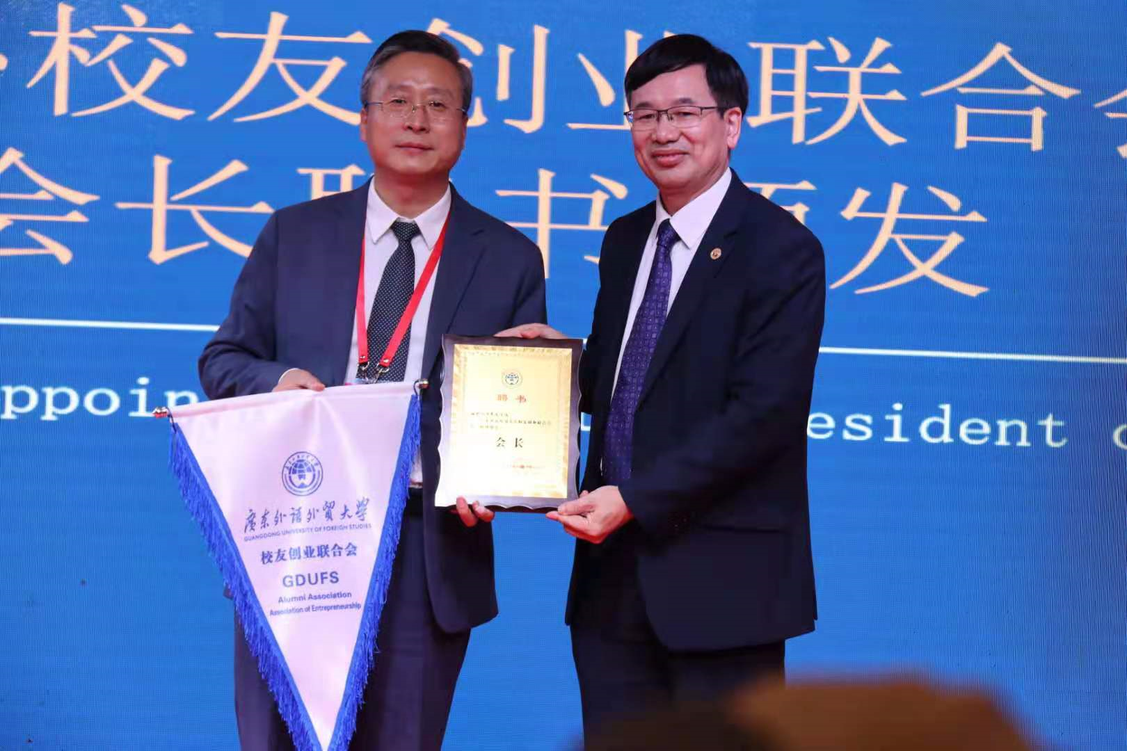 何传添向广外创联授会旗、向会长颁聘书