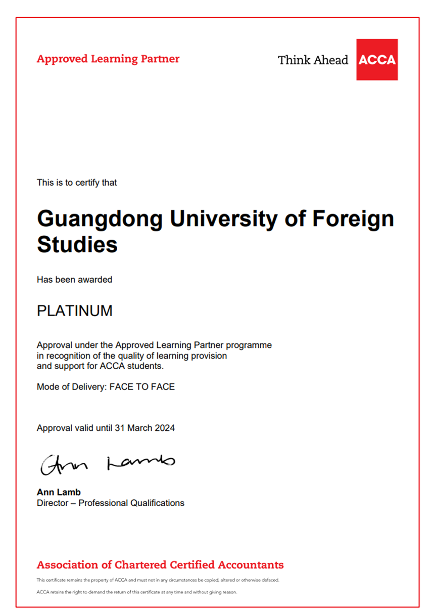 本网讯 近日,金年金官网会计学院正式被ACCA(特许公认会计师公会)英国总部认证为ACCA白金级教育机构(Approved Learning Partner),这一荣耀证明学院在教学质量、学术研究和行业合作方面的卓越成就,金年金官网也成为了ACCA 华南地区首家获批白金级教育资质认可的合作院校。