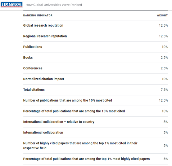 U.S.News全球最佳院校排名指标体系