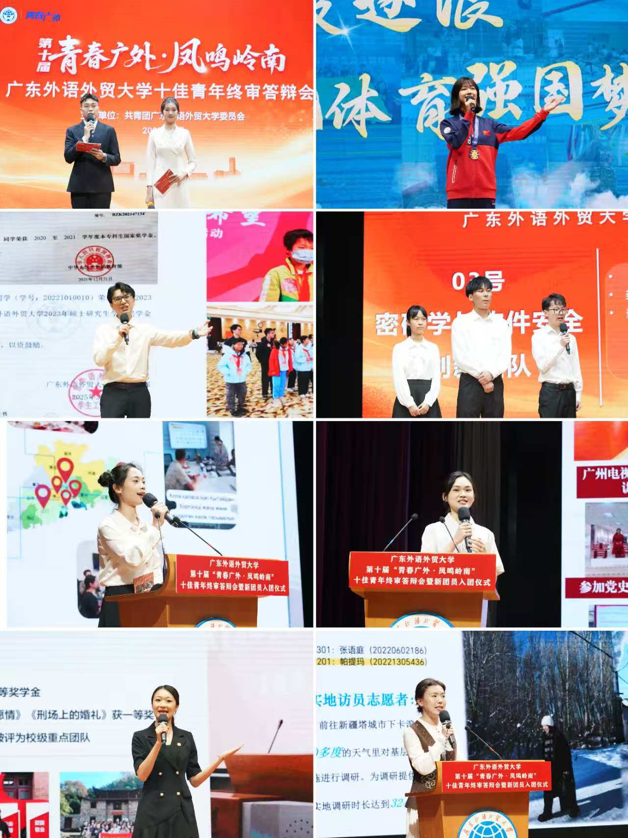 经贸学院彭子茵、商英学院胡秋琳、西语学院麦文疑、东南亚学院唐艺、中文学院谭秀薇、信息学院王俊朗、信息学院陈卓玮、翻译学院黄栋樑、马院甘秋丹、新闻学院帕提玛·卡汉荣获“十佳青年”称号。彭子茵、帕提玛·卡汉、王俊朗荣膺“最佳风采奖”,彭子茵同时获得“最佳人气奖”。
