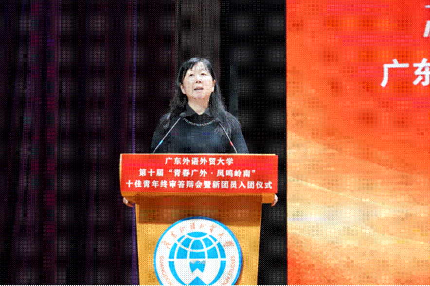 葛小月向参加“十佳青年”风采展示和新入团的同学表示热烈祝贺。她指出,学校以讲述身边青年典型和吸收新鲜力量的方式迎接五四青年节的到来,恰逢其时、意义非凡,广外青年要牢记习近平总书记对中国青年的殷殷嘱托,怀抱梦想,成长成才,并以“人生不是轨道,而是旷野”、“等风来,不如追风去”以及“一花独放不是春,百花齐放春满园”三句话温情寄语全体广外青年向下扎根、向上成长,在青春的征程上主动出击,踏出坚实的步伐,追逐出繁花似锦的未来。