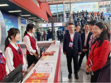 会谈后,谢伟光一行参观了广交会发展史陈列馆,并先后到境外贵宾俱乐部、展馆咨询台、证件中心等工作岗位,亲切走访慰问在岗实习学生。期间,谢伟光副校长与同学们进行亲切交流,听取了他们参与本届广交会实习的感受与收获,勉励大家要始终保持饱满的热情,以扎实的学识和卓越的实践能力投入到实习工作中,将广外学子的优良风貌和综合素质熔铸于行。