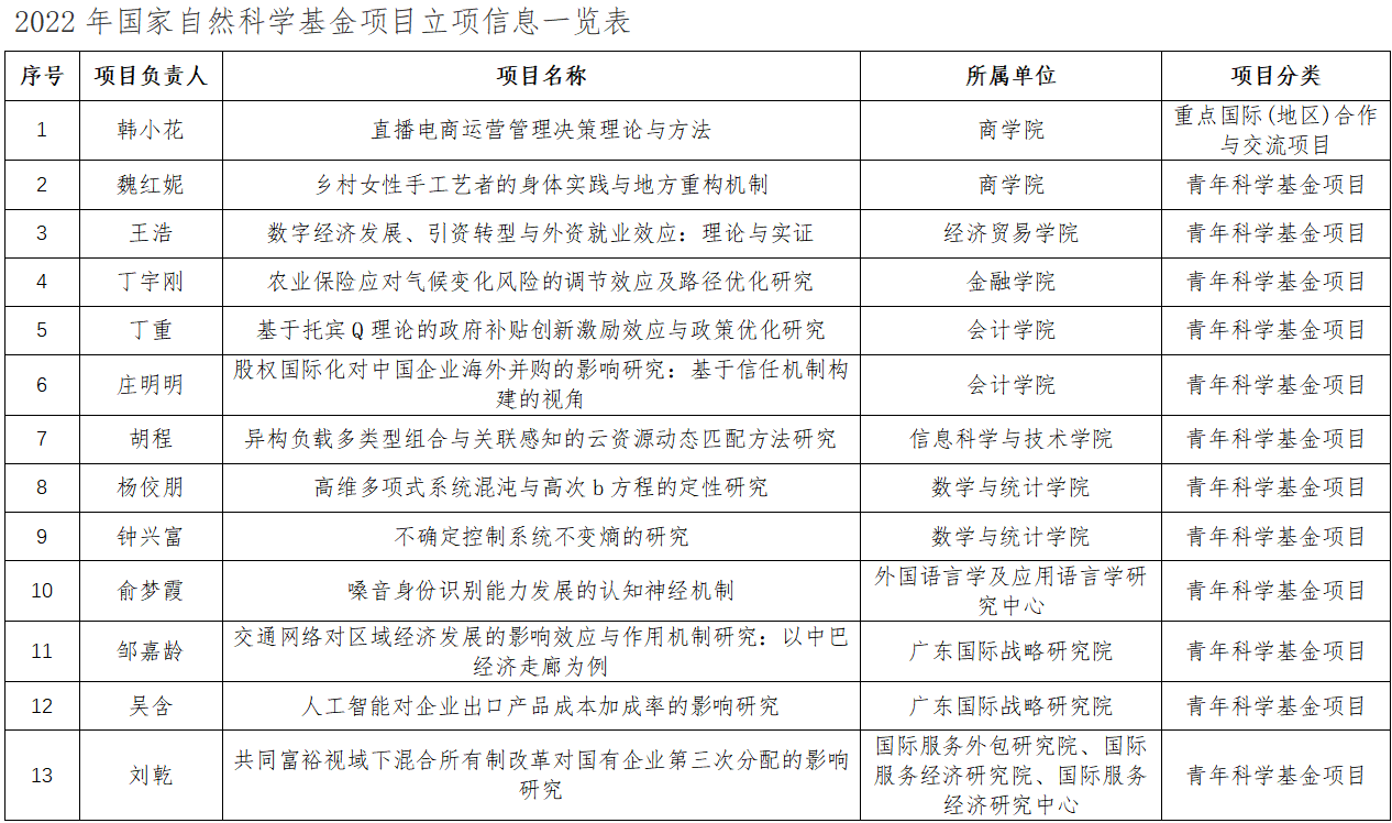 13个立项项目中,青年科学基金项目12项,重点国际(地区)合作研究项目1项。从学部分布看,管理科学部7项,数理科学部和地球科学部各2项,信息科学部和生命科学部各1项。获资助单位中,商学院、会计学院、数学与统计学院、广东国际战略研究院各2项,经济贸易学院、金融学院、信息科学与技术学院、外国语言学及应用语言学研究中心、国际服务外包研究院各1项。