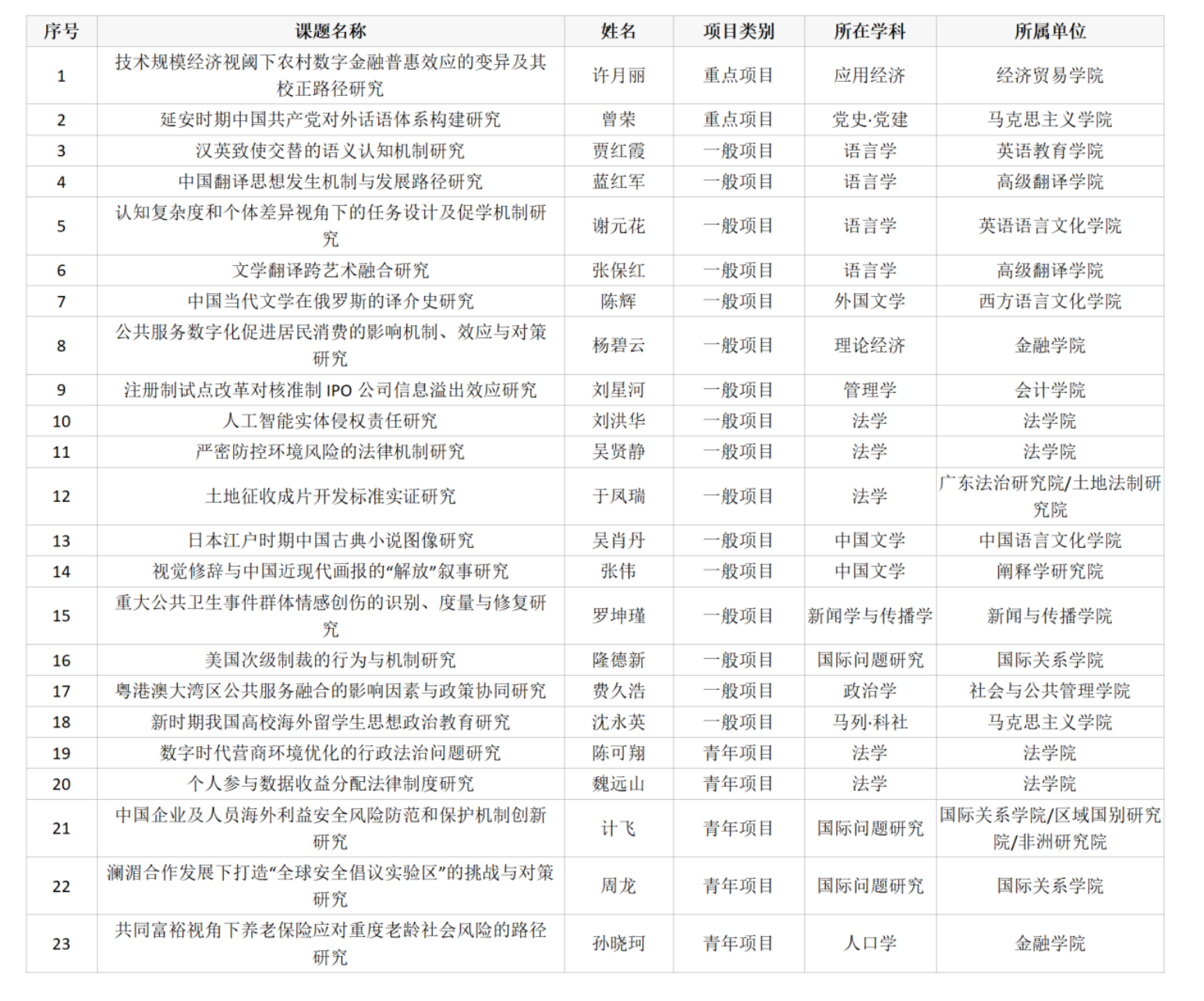 从单位分布来看,法学院4项,金融学院、国际关系学院、高级翻译学院、马克思主义学院各2项,英语语言文化学院、经济贸易学院、会计学院、社会与公共管理学院、新闻与传播学院、英语教育学院、西方语言文化学院、中国语言文化学院、阐释学研究院、广东法治研究院/土地法制研究院、国际关系学院/区域国别研究院/非洲研究院各1项。
